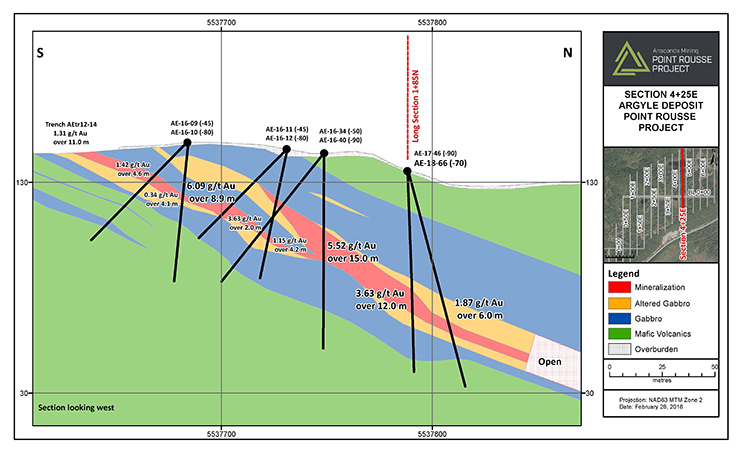 Work completed at the Argyle Deposit since the fall of 2012 has outlined a zone of gold mineralization over strike length of 600 metres and to down-dip extent of 225 metres.