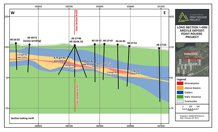 Anaconda is also focused on determining the trend of high-grade zones discovered through previous drilling. The easternmost high-grade zone to date is outlined by drill holes AE-16-33, AE-16-40 and AE-16-43 and averages 14 metres thick with composited assays between 2.91 g/t and 5.52 g/t gold. Recent drilling by Anaconda in early 2018 has confirmed the presence of these high-grade trends with the results from holes AE-18-64, 65 and 66.  The northernmost high-grade zone, outlined by drill hole AE-16-39, is 6.0 metres thick with a composited grade of 9.31 g/t gold and is open along strike and down-dip.